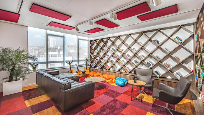 网络游戏公司休息区设计:设计师在设计的时候,将其安置在一个独立的空间之中,空间有休息区、书籍区、乐器区,真可谓是让人眼花缭乱、叹为观止,设计师希望让员工在业余时间之外,可以多增加一点知识和乐趣、兴趣,就算是什么都不做,在此处也是一种心灵的陶冶。