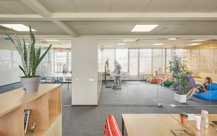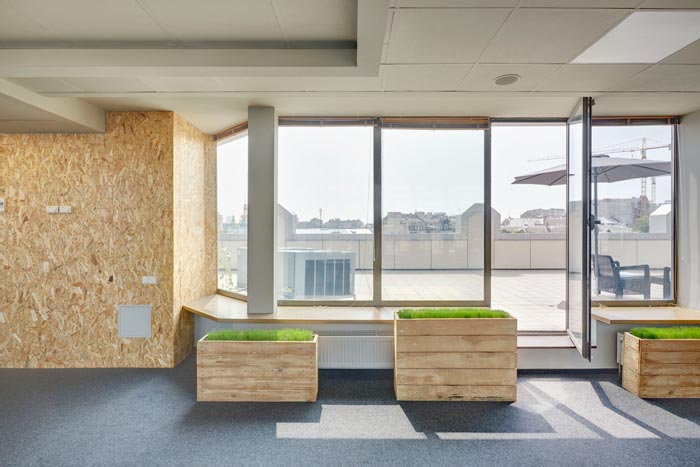 网络公司办公室阳台设计:设计师在设计的时候,希望保留空间的原有属性,故此在设计中设计师基本上没有增添新的设计,只是在原有的基础上增添了绿植,虽然只是一点点小小的增添,却也起到了画龙点睛的作用,为空间带来了自然地气息。