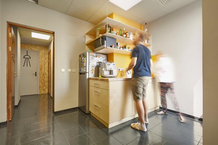 网络公司办公室茶水间设计:设计师在设计的时候,将其安置在一个角落,此处也可以说是一个天然的储存空间,重点在于如何设计,设计师在原有条件的基础之上进行优化,将每一个单间进行重组,这样的设计像是一个艺术品,让人感觉到组合的艺术。