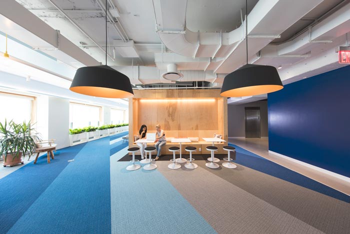网络公司办公室动线设计:设计师在设计的时候,考虑到此处空间地处空间的内侧,故此让光源可以投入此处空间之中,动线的设计也采用不同的色彩进行表现,设计师希望通过这样的设计增加空间的通畅与方便。
