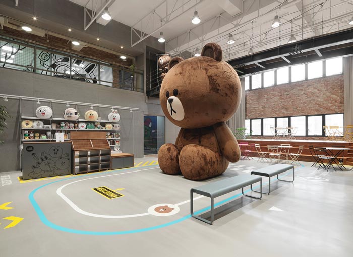 接待区域的设计:设计师在设计的时候,将其安置在展示区域的后方,这样一来就可以利用具象化的卡通人物,其巨大的身形自然的为空间起到阻隔的作用,其次就是此处的氛围充满了温馨、可爱的气息,在这样的氛围中有利于彼此之间的交流,为客户留下一个好的第一印象。