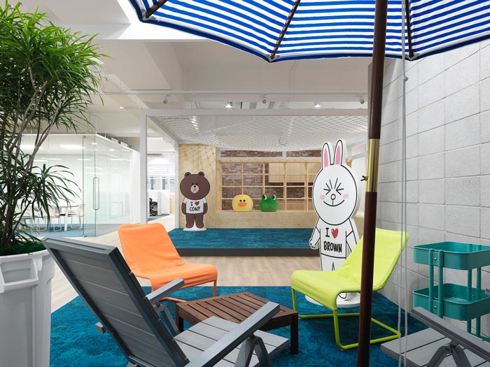 度假区域的设计:此处的设计有一点类似度假海滩的感觉,这样正是设计师设计的目的,设计师希望让员工在办公空间之中可以享受到各种新颖、舒适的自然环境,在此处仿佛置身于海边,蓝蓝的海水、轻柔的风袭来,让人不自觉的感到惬意。