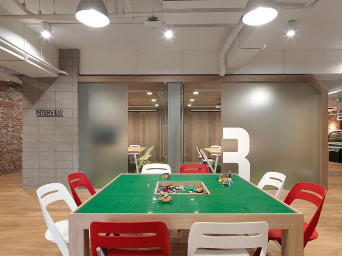 休息区域的设计:设计师在设计的时候,将其安置在一个开放性的独立空间之中,说他是独立性的,是因为空间四周都有框框架架,说他开放是因为虽然周围有框框架架,但是却没有任何的阻碍,员工可以进出自由,在此处玩耍、嬉戏。