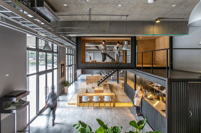 LOFT风格办公室办公区设计:二楼被设计师分为左右两边,且两边没有任何交集,中间被几十公分的空隙隔离,设计师希望让相互之间产生一丝距离,正所谓距离产生美,彼此之间留有一点点距离也是挺美好的。
