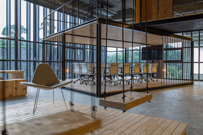 LOFT风格办公室会议室设计:会议室位于一楼的边缘,在这里不会占用空间的主流空间,同时此处也十分安静,十分适合会议的开展,四面透风也让会议室少了很多束缚,让员工在会议中可以畅所欲言。