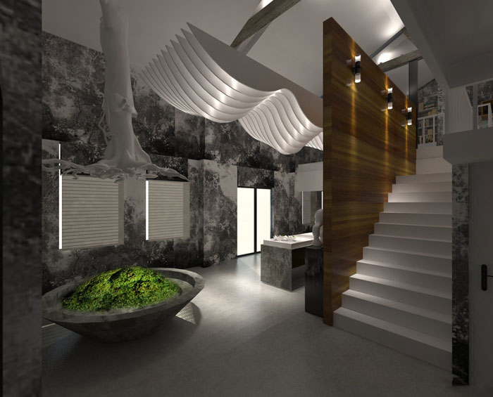 楼梯区域的设计,设计亮点就是漂浮在空中的树、与树根下方的绿地,寓意相互之间的不可分割,随像树但却不是树,形容空间的亦真亦幻,使人对二楼产生浓厚的兴趣。