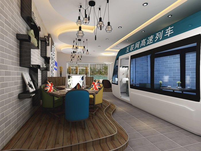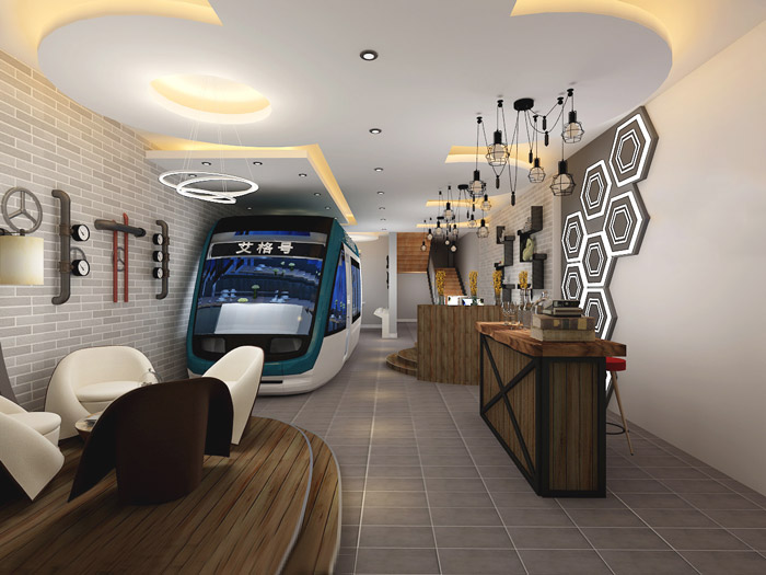 一楼区域的设计,设计师是在一次等待动车的时候来的灵感,看着快速从眼前小时的动车,速度是如此的快速,眨眼间消失在设计师的眼前,设计师观此觉得这与现实的互联网一样,以快速的节奏发展,让人始料未及,设计师希望通过动车式的设计让企业在以后的发展中可以乘着快速驶来的车向前飞跃。