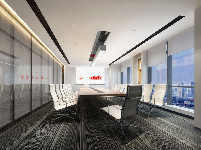 会议室的设计,咋看之下属于暗色系,这也是设计师故意为之,暗色系其中设计师加入了亮色系的元素,比如灯光、办公椅、光源的采用,其目的就是平衡,平衡空间中的各种元素。