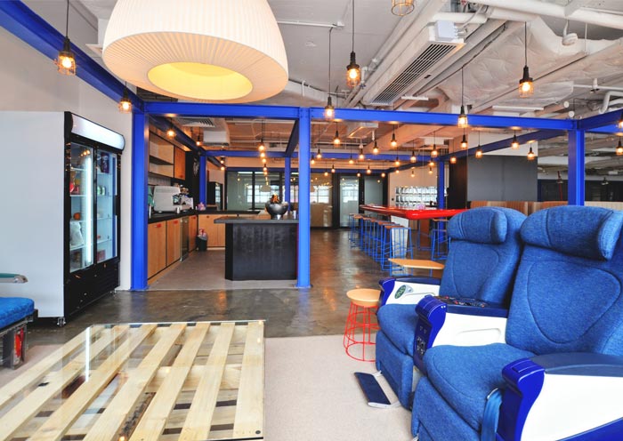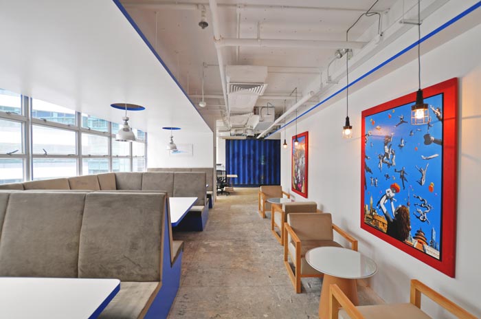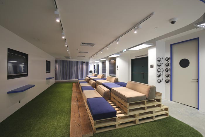 休息区域的设计:此处被设计师安置在一个独立的空间之中,在此处员工可以不穿鞋在地上来回跑,也可以在地上打滚、嬉戏,同样可以躺在座椅上观看自己喜欢的节目,此处就是让人恢复童心,让童心为我们寻找回那丢失的快乐。