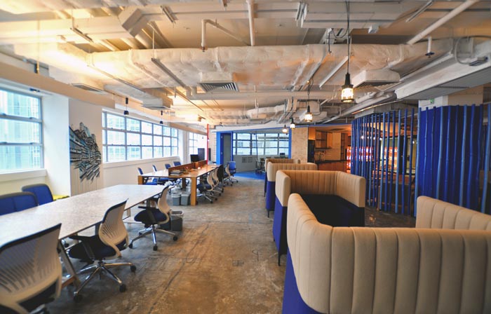 办公区域的设计:过渡区域向内走就会进入一个大型的办公空间,此处空间集合开放、便捷、创意、人性化与一身,目的就是希望在办公之余可以释放空间的面积,在办公时一篇欣欣向荣,在休息时空间重归寂静,吊桌的设计将柱子很好的利用起来,做到化腐朽为神奇。