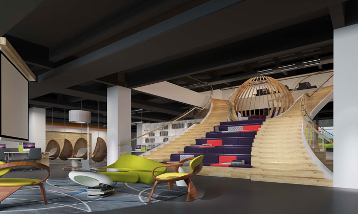 休息区域的设计,此处区域最大的亮点就是,设计师将楼梯设计成一个可以走的的座椅,因为此处除了担任休息区域之外,还有一个额外的功能就是培训区域。