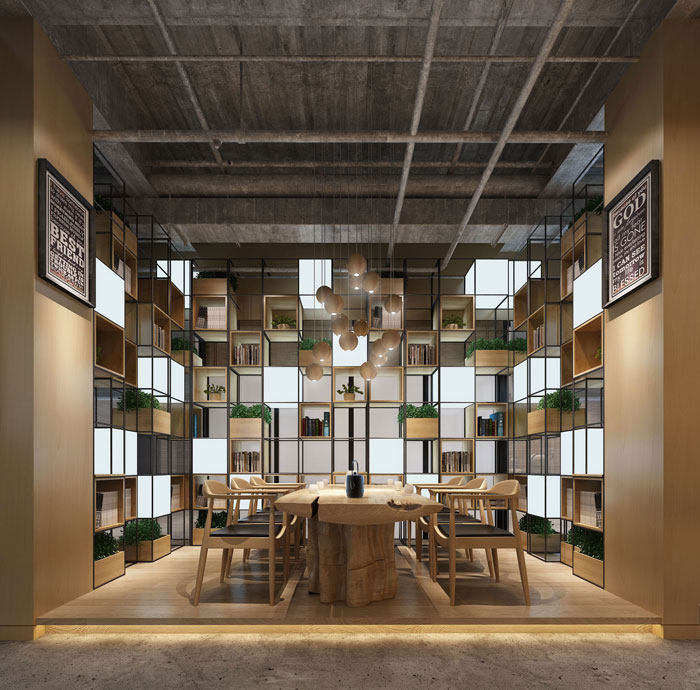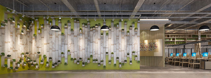 洽谈区域的设计,设计师特意设计成绿意空间,设计师认为人们往往远离大自然,因此需要在空间中多增添一些绿色,虽然面积有限,但能给交谈提供一个很好的洽谈环境。
