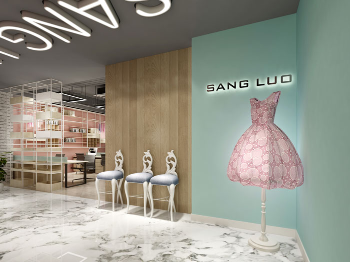 进门区域的设计,设计师以低调、精致而不奢靡为主要设计,时尚、自信而不浮夸为辅助设计,以此来体现企业产品优雅、高尚而又平易近人的优良品质。