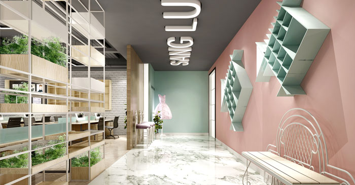 进门过道区域的设计,设计师每一个用心布置,就会产生小小的惊喜,让员工、客户忘掉繁杂、拥扰的都市,每一次不经意的感动,都是流淌在心底的丝丝甜蜜与爱意。