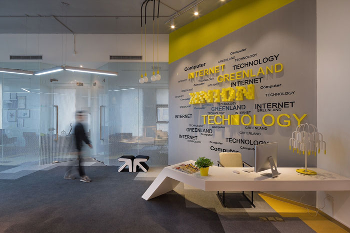 接待区域的设计,设计师在设计的时候,将其平行于前台区域,两者相辅相成,一边引导客户凸显企业文化、一边接待尽显地主之谊,显示出企业人性化的设计风格。