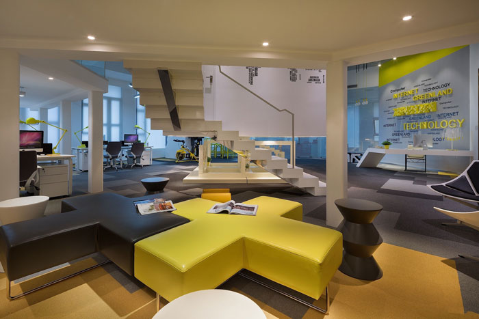 会议室的设计,设计师将其安置在空间的中心,一则做为企业的亮点存在,二则悬空的空间给人以俯视的感觉,本空间不论是内部还是外部都携带创意的属性,这样的空间使人灵感无限。