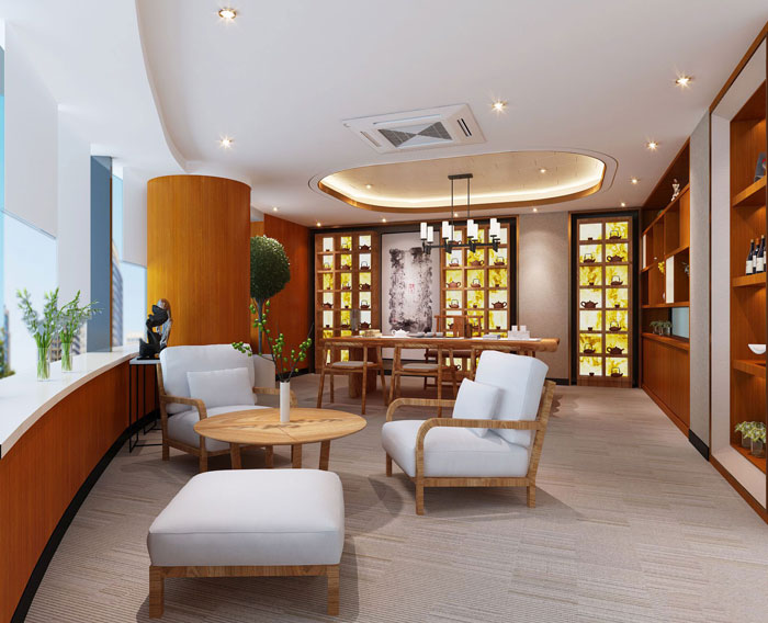 A办公区域的设计,设计师以左右不对称的手法进行设计,看似不对称,实则是留白性,使整个空间更为协调精美而有意留下相应的空白,留有想像的空间。