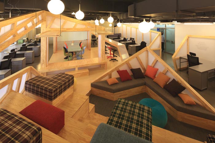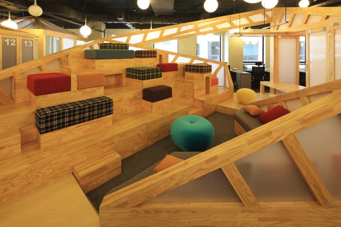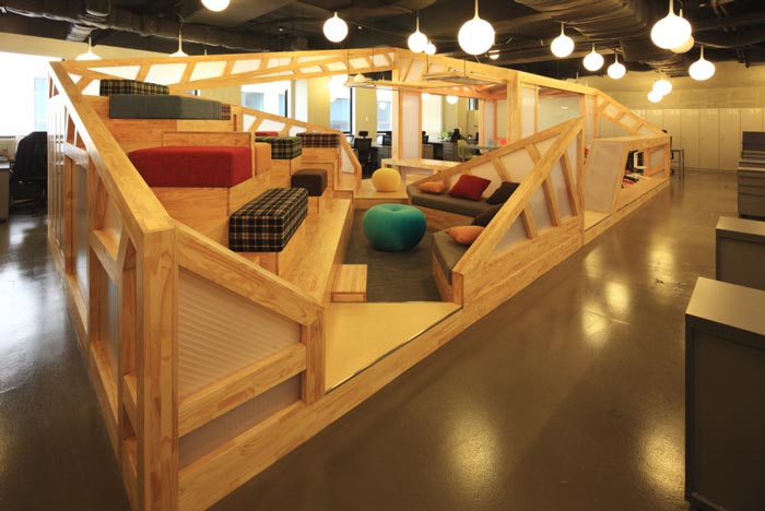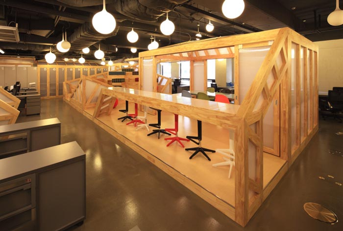 会议室的设计:设计师在设计的时候,将其安置在空间的中心区域,将此处做为中心来设计,在设计师看来会议室是一个企业进步的阶梯,在此地员工自由发挥、畅所欲言,有的坐在吧台区域、有的坐在木材搭建的休息台桌上,在和谐的氛围中大家相互交流,在欢快的氛围中完成让员工可以放开心扉,与企业相互融为一体,感受到自己的责任。