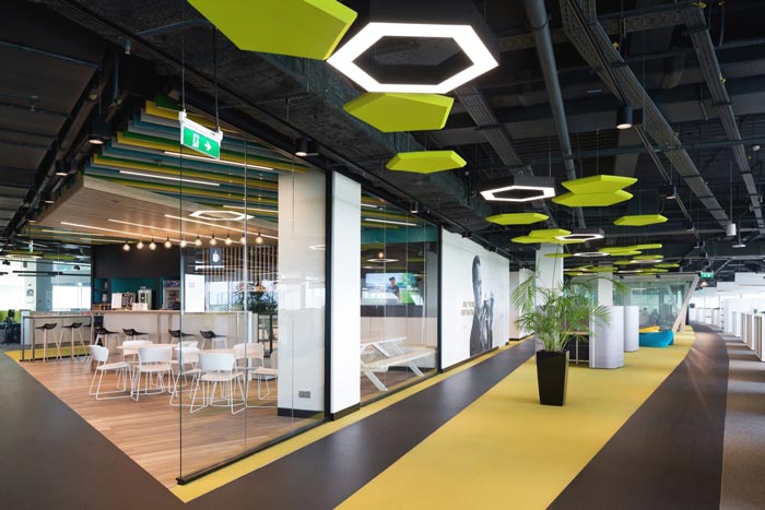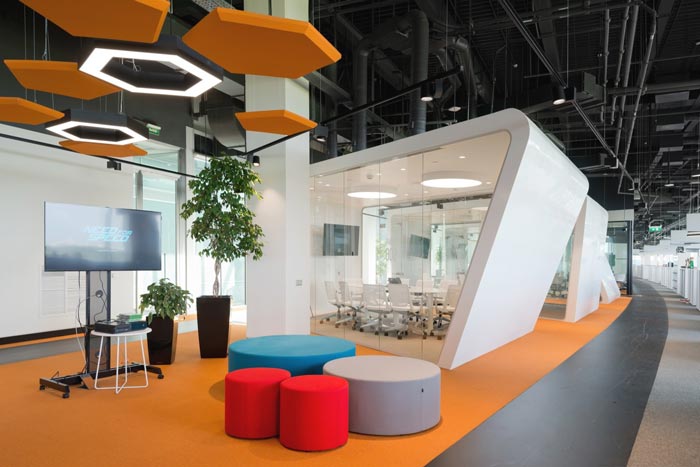 办公区域的设计:设计师在设计的时候,将办公空间采用开放式的设计手法,在设计师看来开放式有其不可替代的优势,在设计的同时设计师又利用办公桌+隔断将其分离成一个小小的空间,在开放的同时为员工预留足够的私人空间,将开放式空间的优势发挥到极致。