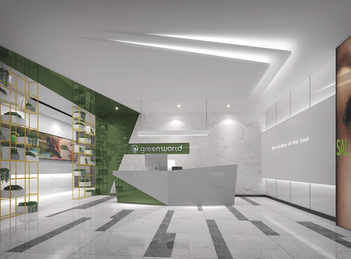 前台空间的设计:设计师在设计的时候,大量使用了纯白色灯带,加之其立体造型,力求将整体科技、前卫的风格渗透于整个空间,再搭配绿色的点缀,整个公司生机勃勃的发展之势跃然而出。