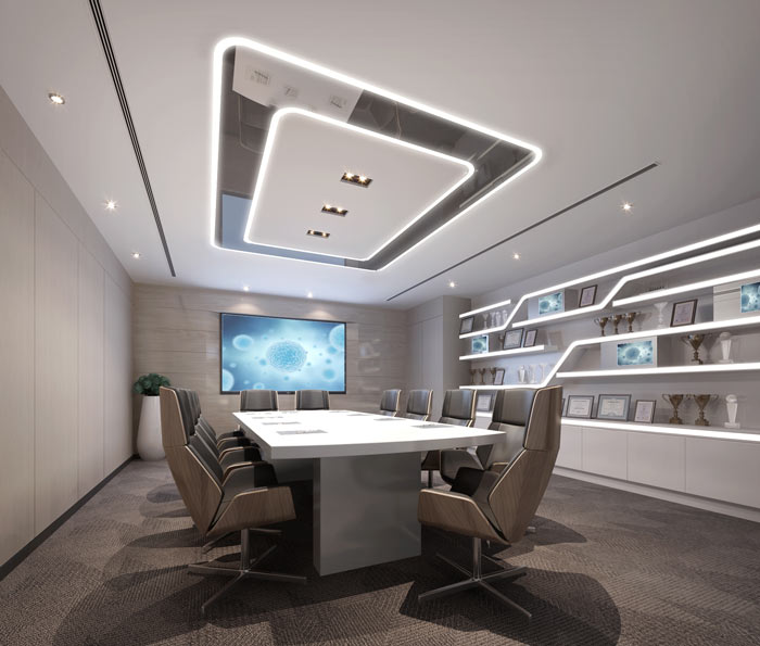 会议室的设计:设计师在设计的时候,希望在满足空间基本功能之外可以为空间增添新的属性——展示,在设计师看来此处区域不仅可以作为会议室,同时也是与客户进行交流的场所,设计师希望让客户对企业有更多的了解。