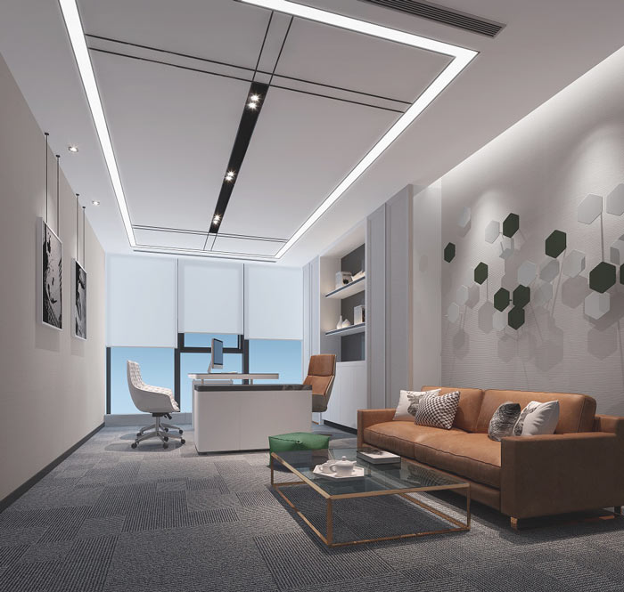 总经理办公室的设计:设计师在设计的时候,将办公桌安置在靠近窗户的区域,设计师希望让总经理本人可以时时刻刻俯视外界空间,俯视的角度不同得到的结果也是截然不同,设计师希望让总经理可以在空间的帮助下不断的提升自己的心境与眼界。