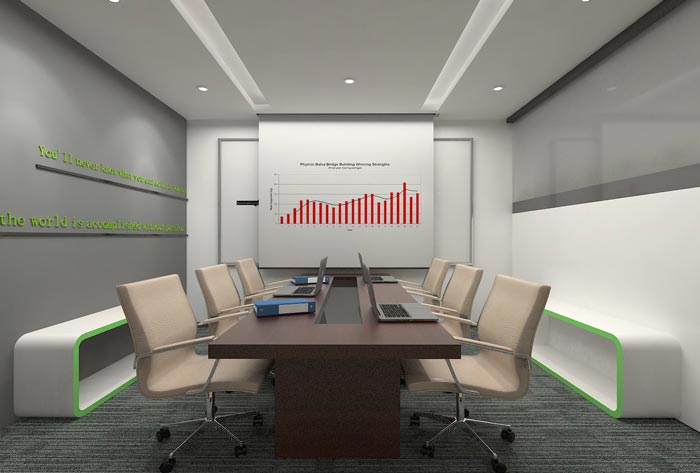 会议室的设计,设计师在设计的时候,将会议桌安置在中心区域,这样在保证基本的需求之外,还可以使动线分布在两端加大空间的活动空间,同时在不影响空间功能的前提下,设计师利用软装来增加空间的承载能力。