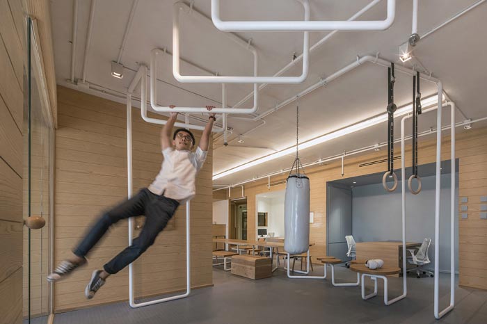 IT公司办公室单杠区设计:此处主要是员工活动、健身的区域,这也是此次办公室设计的一大亮点,设计师将健身巧妙的融入空间,当员工劳累的时候,可以来这样锻炼一下,一来强身健体,二来打破心中忧郁。