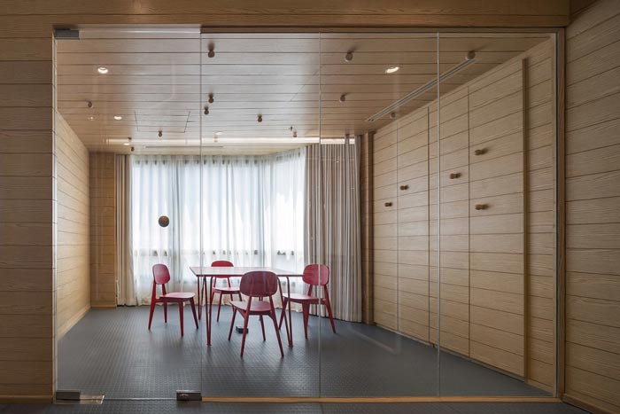IT公司办公室会议室设计:推拉门的出现让空间有了更多可能,在平时推拉门被隐藏起来,不仔细看基本发现不了,当会议开展的时候,推拉门有效的隔绝整个空间,一个小小的门为整个空间扎上了腾飞的翅膀。