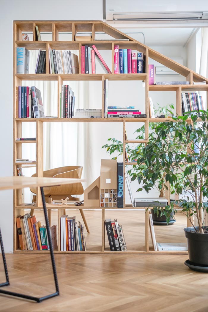 阅读区域的设计:此处是两个承重墙中间的区域,设计师为其量身定做了书架,在尺寸的把握上也相当到位,同时在右上方设计师突发奇想的留下了一个缺口,设计师的原意是完全契合,但是在设计当中发现四四方方的设计与空间有一点格格不入,有点太严肃了,一个缺角的变化让此处有了一丝调皮。