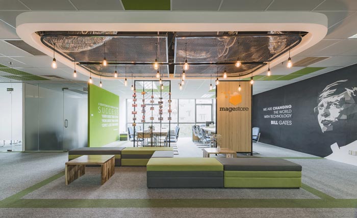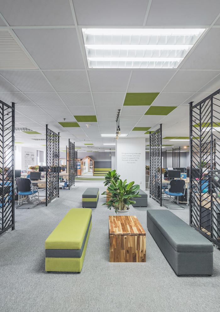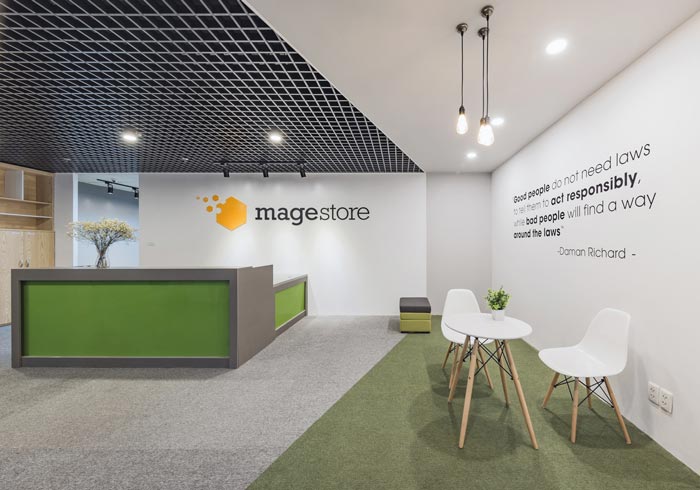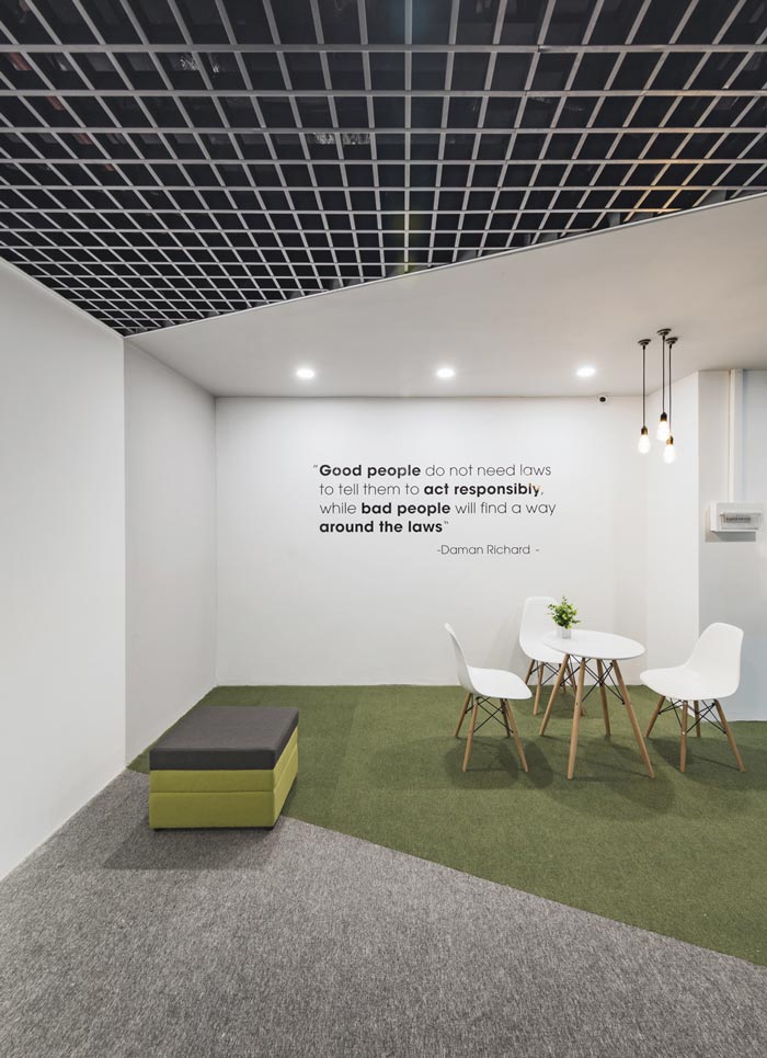 电子商务办公室前台设计:设计师在设计的时候,在主色调的选择上采用白色,在设计师看来白色可以兼容所有的色彩,同时白色本身有向外散发的特性,设计师希望借用这种特性,让前台在视觉上趋于分散,以此奠定各个区域位置的分布,同时绿色、浅绿色的设计,让各个区域泾渭分明。