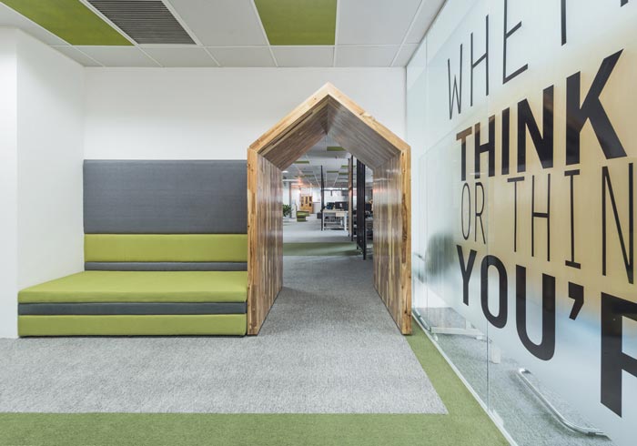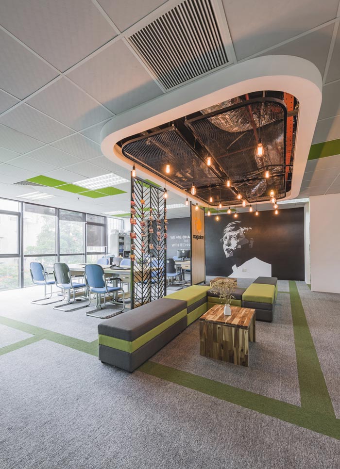 电子商务办公室休息区设计:设计师在设计的时候,将其安置在一个真空区域,之所以说是真空区域,是因为此处处于动线的尽头,设计师希望此处可以保持通畅,以此避免对整个空间造成影响,另一方原因就是此处的采光极好、环境也极其安静,在此处员工可以脱离工作的压力,在此处放空自己。