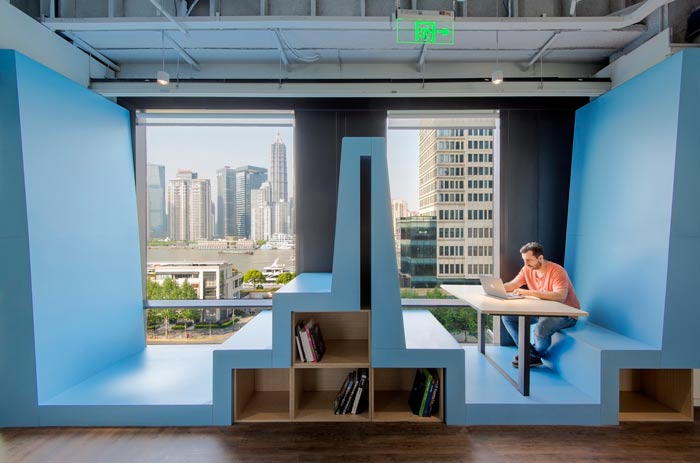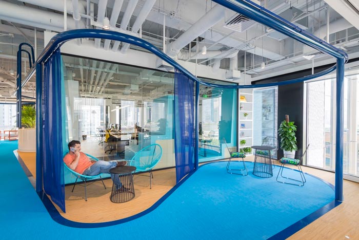 旅游公司办公室休息区设计:在这里可以俯视城市的众多美景,同时此处也是员工的休息区与办公区,企业没有特别规定员工一定要在办公区域办公,而是希望给他们相对的自由,让员工在这里找到家的感觉。