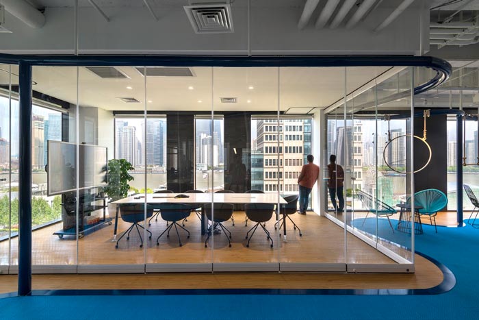 旅游公司办公室会议室设计:当隔断门全部连接在一起的时候,一个隔音的会议室就此形成,设计师将会议室安置在此处,一来此处采光极好,二来此处景色极美,仅此两点就让空间更加有活力。