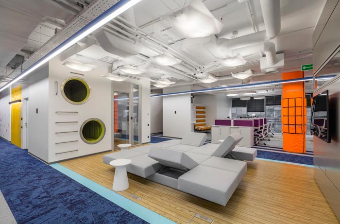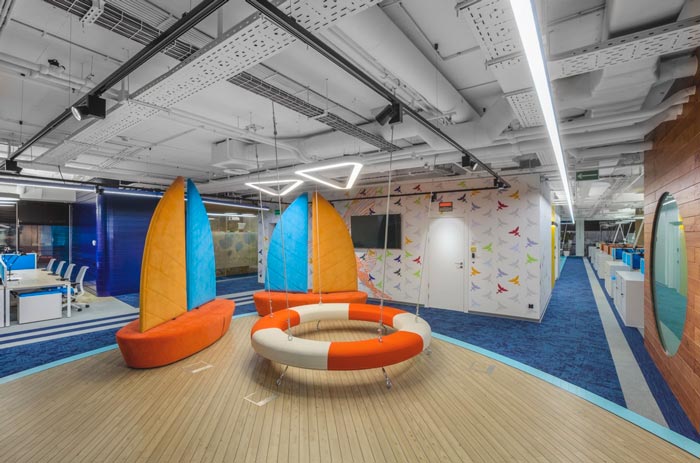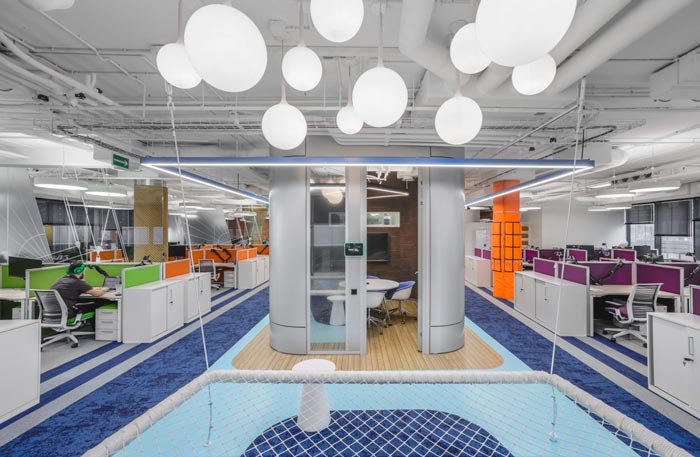 办公区域的设计:设计师在设计的时候,将办公区安置在空间的两侧,中间部分主要以洽谈、休息为主,同时在办公区域设置的同时,利用色彩的转变来区分部门的位置,每一个部门之间都有一定的缓冲地带,这样做的目的就是希望在开放的空间内保留员工的私人空间。