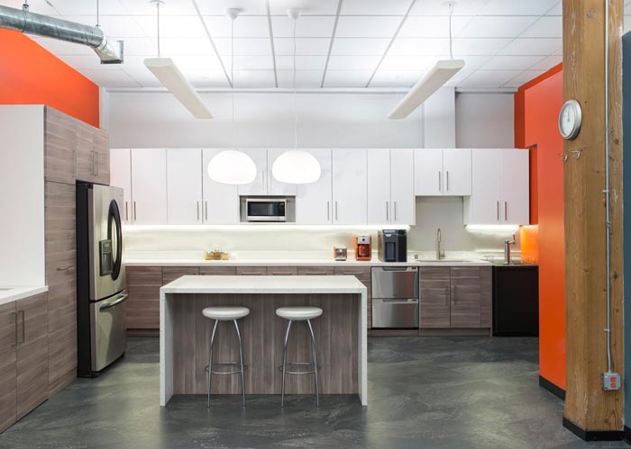 茶水间的设计:以厨房为原型做为设计参考,目的就是将空间打造成一个集办公与家庭相结合的空间,让员工在办公的同时无时无刻都感受到家的温馨,这样对于企业的发展有很好的促进作用,设计师希望让关心、温暖成功企业的代名词,让关心、温暖成为企业发展产品的动力与原则。