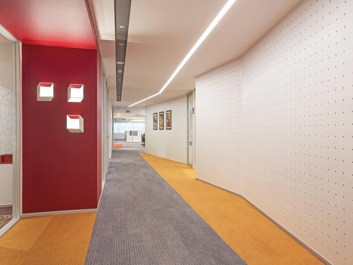 过道的设计:设计师在实地考察的时候,发现此处空间的过道呈不规则的方式向内延伸,由于不规则本身就充满了不确定性,设计师为了避免故此在设计中,采用色彩之间的转变来弥补空间的不确定,白色有向外延伸的属性、黄色有中和的属性、灰色有稳定的属性,三种颜色交织在一起,将不确定性化为空间的一种独特的风景。