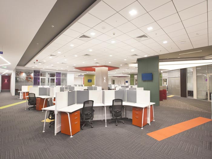 办公区域的设计:此处是整个办公区域的一个缩影,设计师在设计中尽量避免有棱角的出现,所以以圆形为构思平台,希望搭建一个开放与私人相结合的办公场所,一个半圆的办工桌原型由此产生,这样的模型既可以作为圆形的组成部分,也可以在开放式设计的同时为员工打造一个私人空间。