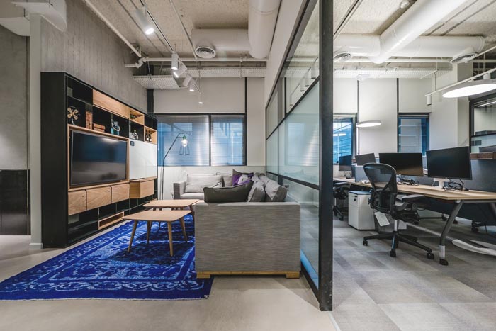 办公区域的设计:此次是一个独立部门的办公空间,在这里设计师考虑到部门的特殊性,故此将空间利用隔断一分为二,交流区域、汇报区域合成一处,这样的设计不仅提升了办公的效率,而且在员工劳累的时候,此处也可转化为休息区域,让员工在这里休息。