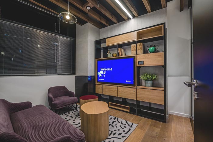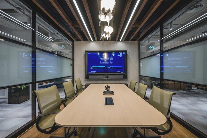 汇报区域的设计:此处主要为汇报工作之用,周围设计师利用隔断将其进行分离,目的就是为了不受影响,但同时透明玻璃也为空间提供了足够的自然光,大液晶屏幕挂在空间的前方,一切都清清楚楚,设计师的目的就是希望汇报可以顺顺利利。