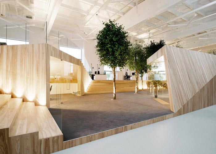 童装公司办公室动线设计:由此可以看出整个空间被分割成一个个开放的木制空间,设计师这样做的目的就是希望整个空间没有任何阻碍,大空间加上清新的空气洗涤劳累的身心。