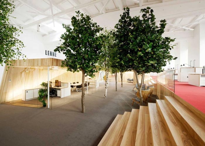 童装公司办公室进门区设计:进入空间后首先看到的就是一排排树木向内延伸,这样的设计让人眼前一亮,空间的空气也格外清新,让人完全感受不到这是在是室内,设计师希望在客户心中留下不错的第一印象。