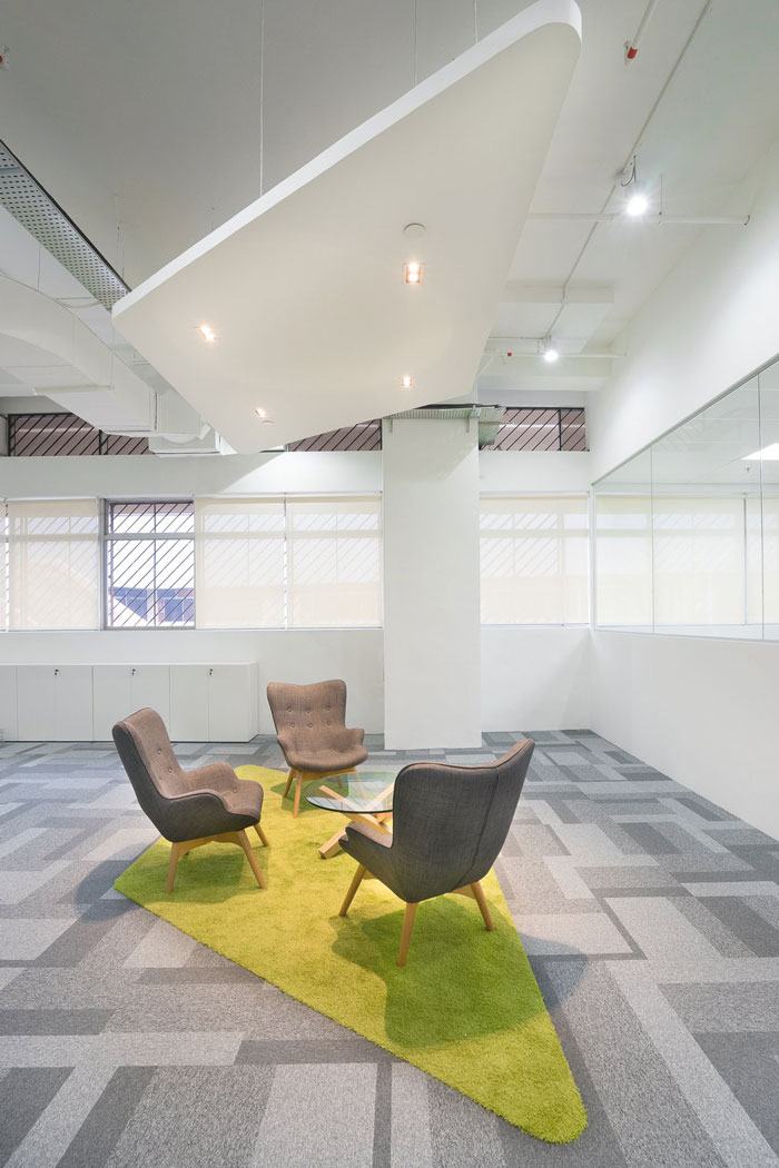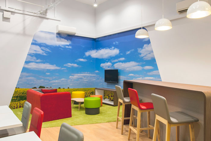 休息区域的设计:设计师在设计的时候,将其安置在空间的一个角落区域,设计师希望在室内为员工打造一片净土,在此地没有压力、没有束缚,设计师为了达到这个目的,故此在设计中采用墙纸的具象使的外景得以在室内重现。
