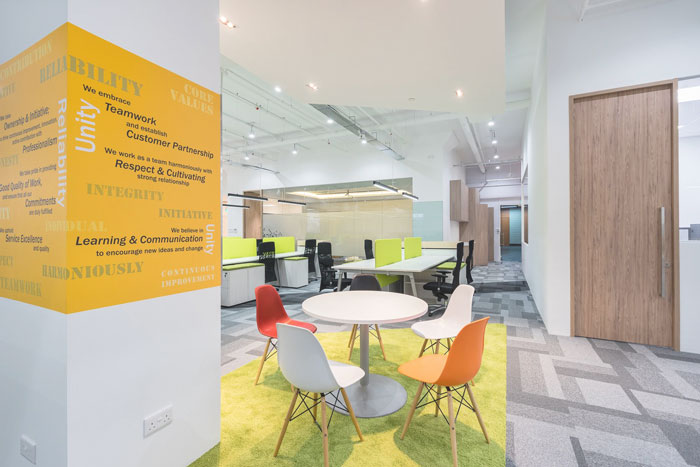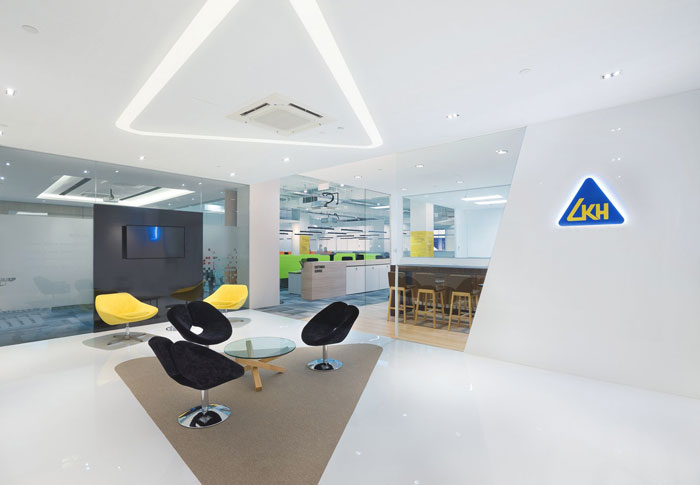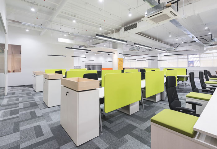 办公区域的设计:设计师在设计的时候,在整体上依然采用了开放式的设计手法,只是在细节上做了一点小小的调整,就是在办公桌的后方加上了可上可下的挡板,这样的设计有效的规避了开放式空间的缺点,在满足办公区域开放的同时也为其打造私人的办公区域,为每一个人预留了个人空间。