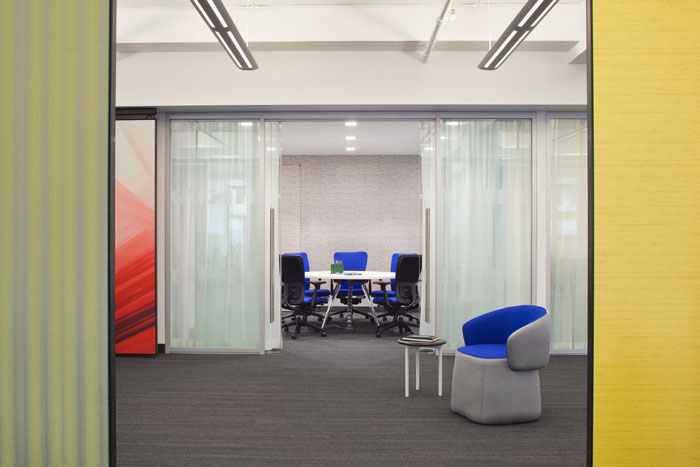 办公区域的设计:悬挂的隔断如一扇扇门将办公区域挡在视线之外,但悬挂的隔断不是死的而是灵活的,一扇扇可拉可合,开放的办公区加上半封闭的个人办公区,两者之间形成一个很好的结合,这样的设计旨在消除弊端,同时也在为企业营造利于发展的办公新格局。