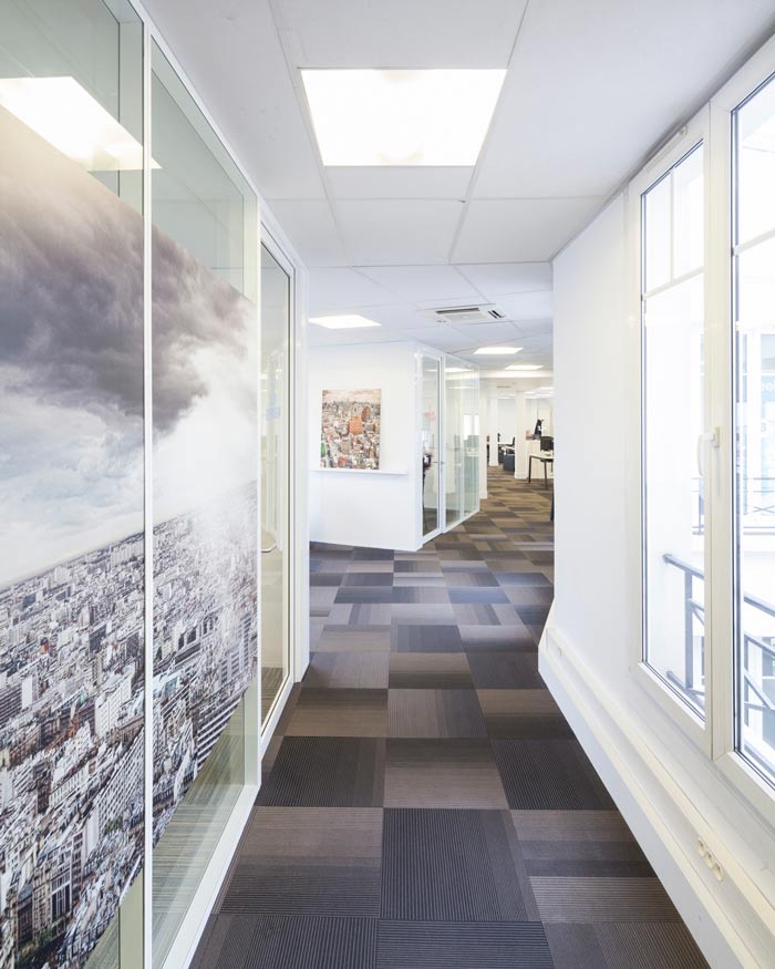 空气环保公司办公室过道设计:过道呈弯曲状分布,一边是工业发展所带开的严重空气污染,另一边是白色的墙壁与阳光,综合起来看想成鲜明的对比,犹如天空中的白云,污染与治理两者之间此消彼长。