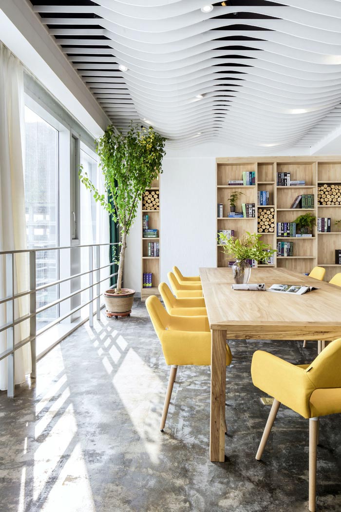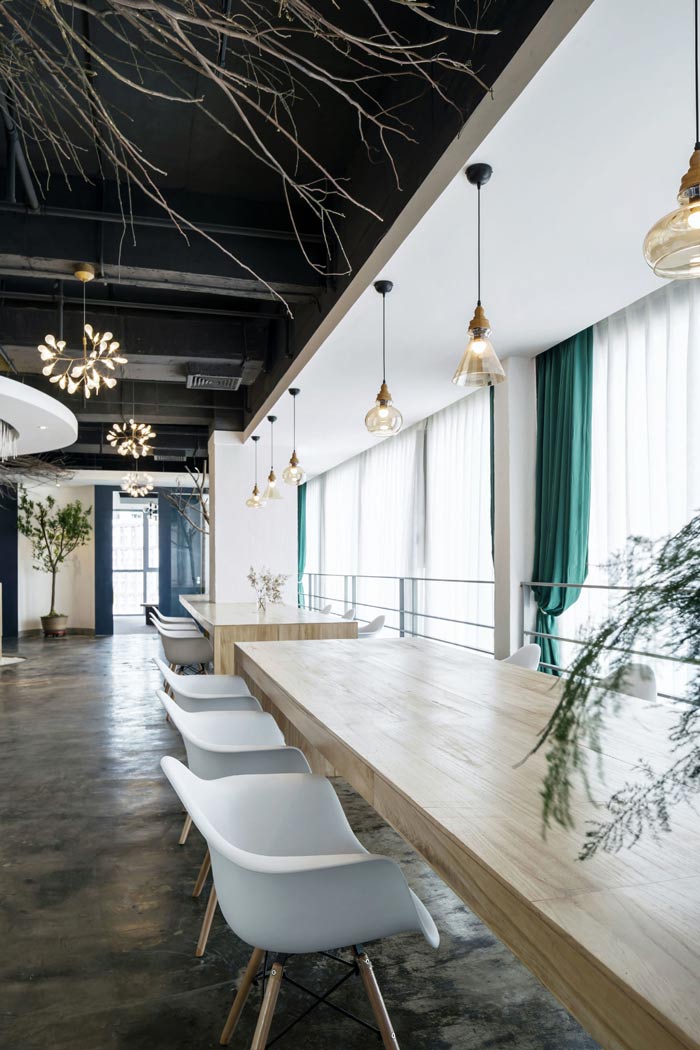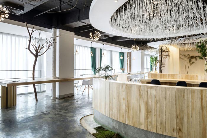 环保公司办公室左侧设计:前台位于空间的中央,往左走看到的有树木、绿竹与灯光组成的开放式办公空间,三者相互结合在一起,无形中增加了空间幽深之感,在点缀空间的同时,也加深了空间的视觉感受。