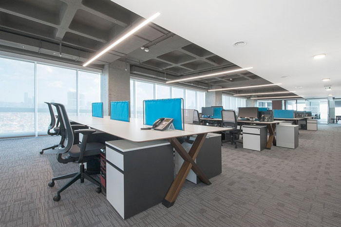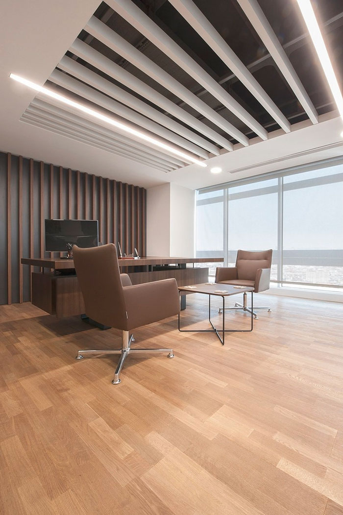 金融办公室办公区设计:设计师在打造办公室的同时,也在强调办公室室内与室外之间的联动,在设计师看来复杂的金融对于每一位员工来说,长期都会让人感到心力交瘁,这也是极简设计受欢迎的原因,因为简单的空间本身就拥有抵消复杂的效果,一线江景的引入也为员工营造一个轻松、舒适的办公空间。