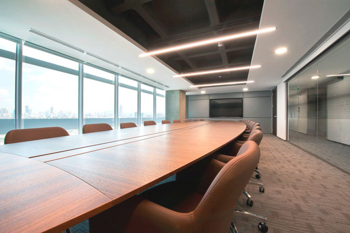 金融办公室会议室设计:整个会议桌呈椭圆式分布,几乎占据了整个空间的中心区域,这样做一来是为了满足企业对于人数的需求,同时也是为了采用去中心的设计手法,在这样的办公空间中,思维与想法不会受到任何的阻隔,同时水的引入,也将上善若水哲学思维引入室内,给会议不一样的文化暗示。