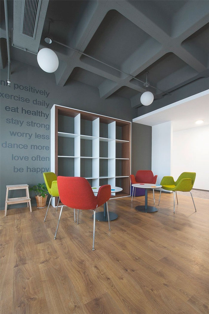 金融办公室阅读区设计:设计师在办公室设计的时候,将其分布在办公室的一个特定区域,此处本身与整个办公室相互不协调,设计师为了有效的加以避免,故此将其从大空间中分离出来,此处设计的中心思想就是简单,此简单非彼简单,而是想给员工一个独立、安静的阅读空间,让大家在此地可以安心的阅读、成长自身。